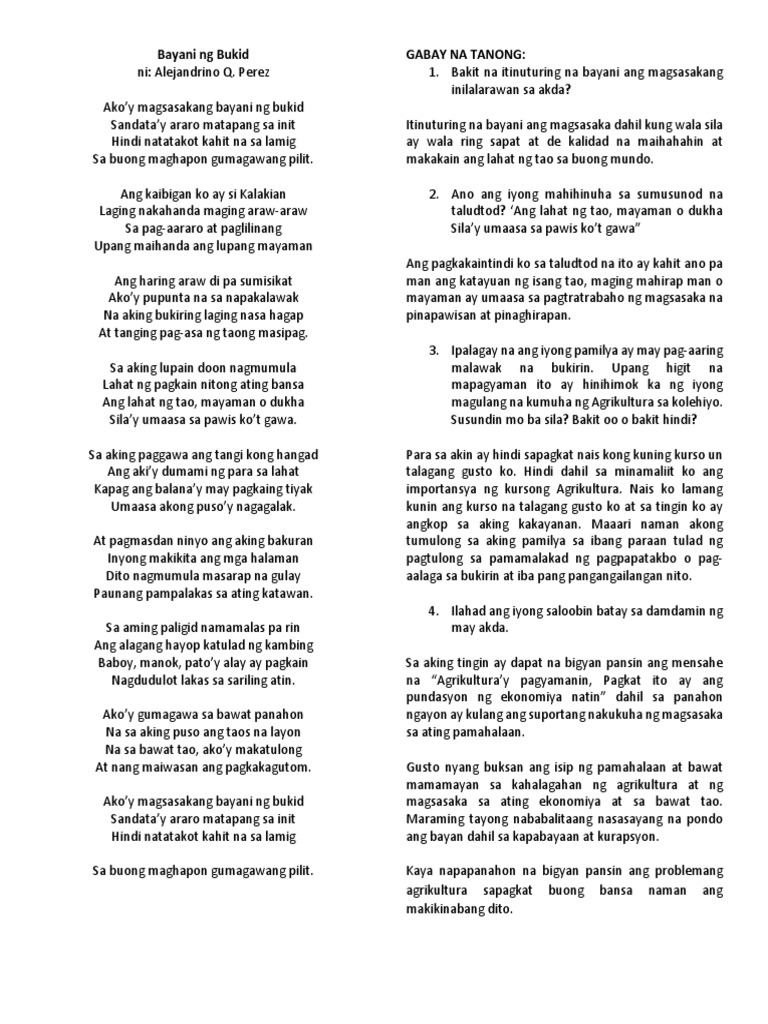 26012021 BAYANI NG BUKID Sa paksang ito ating pag-aaralan kung ano nga ba ang kahulugan at aral na makukuha natin sa tula na Bayani Ng Bukid. Na isinulat ni Al Perez na nagpapahalaga sa larangan ng agrikultura at ang naidudulot nito sa atin. Paano nagkakatulad o nagkakaiba ang mensahe ng tulang Ang Tinig ng Gansa sa tulang ito.