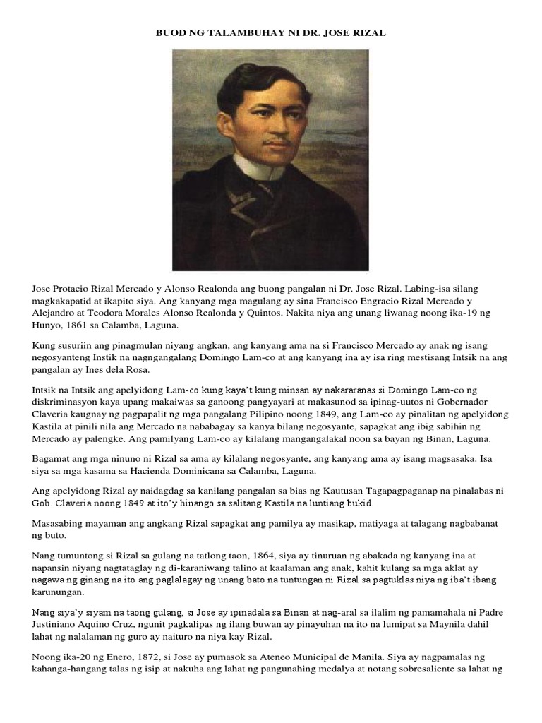 Ang kanyang mga magulang ay sina G. Maaari itong tungkol sa ibang tao o kaya sa manunulat mismo. Jose Protacio Rizal ay ang Pambansang Bayani ng Pilipinas.