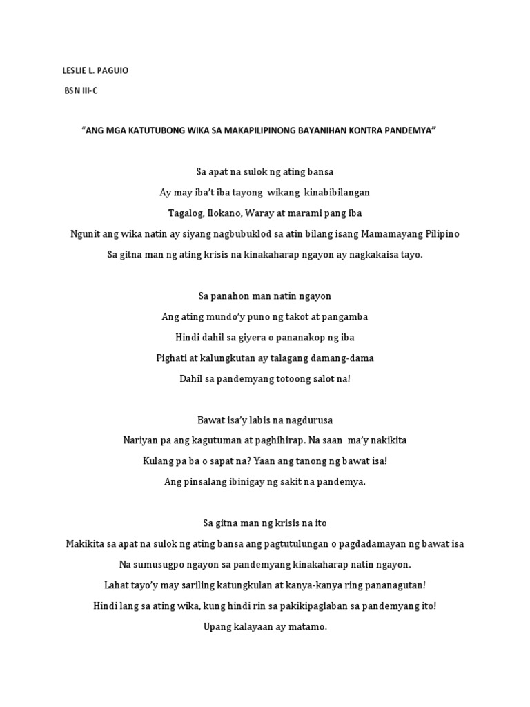 Tagalog diy siyang minamasama pa. Tula tungkol sa bayanihan sa ngayong pandemya. Na lumalaban para sa ating karapatan Nagtatanggol sa kinabukan ng ating kabataan.